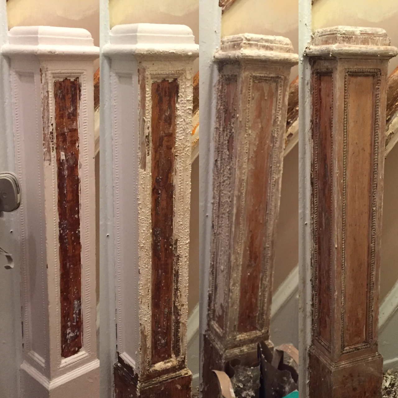 We finally started the stair/front hall project! I guess technically we started it 5 + years ago when we stripped some paint off of the newel post and handrail (first pic on left). If I recall, we were testing a heat gun? And then we left it like that as we finished a dozen other Projects. Here we go, time lapse sneak peek: