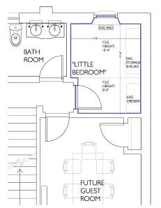 June 2011: Currently our third bedroom, which we affectionately call the “Little Bedroom”, is a storage room. We keep our renovation items to install in there, as well as our “work” clothing, and even some tools. As the only room on the 2nd/ 3rd floor with a protected floor (existing carpet), we tend to do anything messy in there (example: using the wet saw for the bathroom project). But things are a’changin. Here are some photos. Here is the existing plan: